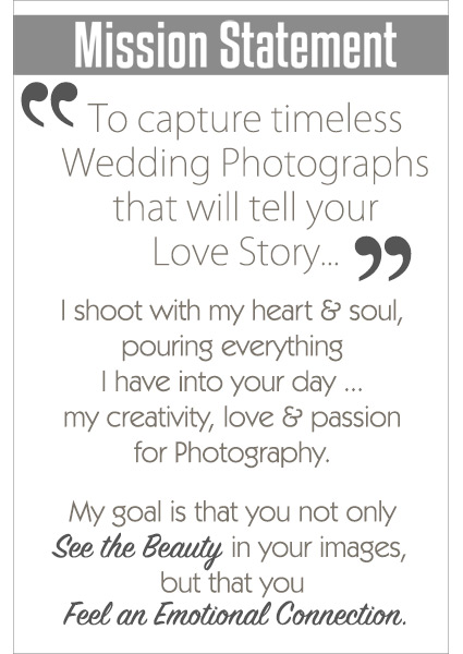 MY APPROACH | I do not have any clearly defined expectations going into a wedding day, except to give 110% of myself.  Every wedding is different, every couple is different, the energy of the day is different and even the weather can change at a moments notice.  Therefore, my goal is simple...to capture images that will allow the couple, their friends & family to see how truly amazing their love story is.  I shoot a mix of both candid and posed photos on a wedding day.  I feel it is important to capture not only the beauty of a couple, but also the beauty that shines from within.  I am dedicated to documenting all the happy moments, the love, laughter, tears, those secret glances, as well as the details and all the things that make that wedding special, unique & fabulous.  Please take a look at my website galleries to get a better idea of my Photography Style.